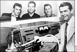 Shown here, from left, are Elvis, bassist Bill Black, guitarist Scotty Moore, and Phillips.